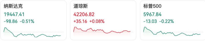 截至收盘,道指涨35.16点,涨幅0.08%,报42206.82点,纳指跌0.51%,报19447.41点,标普500指数跌0.22%,报5967.84点。